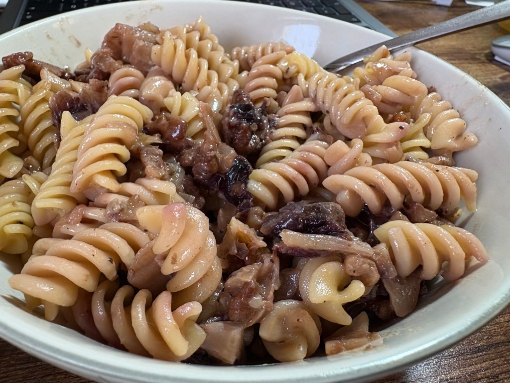 Zum Mittag die Reste der Radicchio-Gorgonzola-Pasta von gestern.