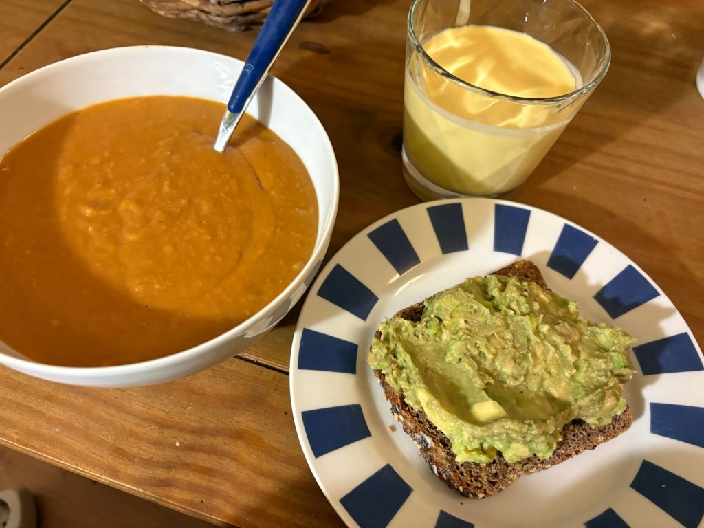 Zwischen all dem und noch bis ganz schön spät sitze ich die ganze Zeit fleißig am Schreibtisch. Nach dem zweiten Webinar wechsle ich 19:30 in die Küche und koche mir aus Crowdfarming-Süßkartoffeln, Crowdfarming-Zwiebel, Cashewcreme, Ingwer und grünem Chili ein Süppchen, dazu Crowdfarming-Avocadobrot und Mango-Lassi.