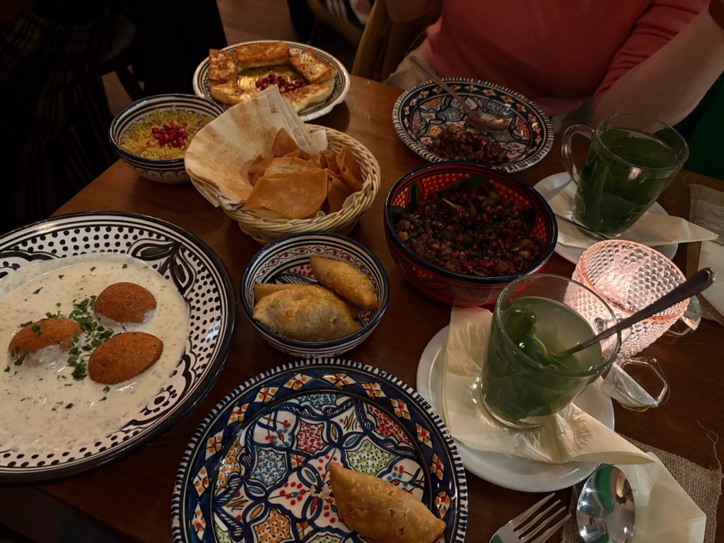 Früher Feierabend dann, denn ich bin zum frühen Abendessen im Fhain verabredet. Mit einer der neuen Bekanntschaften von den Timeleft-Dinnern esse ich syrische Leckereien und rede direkt nach Ankunft über die großen Themen – Welt, Menschheit, Fügung – und dann über die kleinen – Tanzen, Weihnachtspläne, Familie. Dazu Thymian-Käse-Dingsis, Granatapfelsalat mit Rotkohl, Lamm-Kibbeh mit Pistazien und Minzjoghurt, Halloumi, Pita und Minztee.