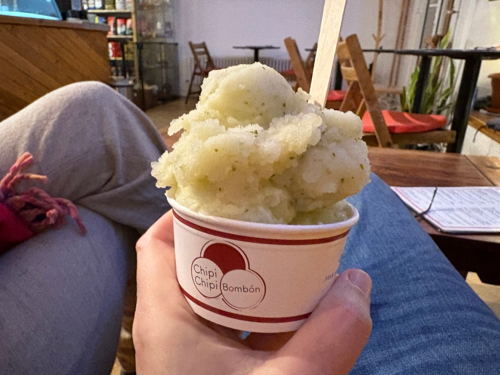Hinterher spazieren wir im Regen bei immer noch 12 Grad hinüber in das Eiskaffee, das mir mein Bruder seit Ewigkeiten nahelegt und ja, er hat Recht. Wir sitzen gemütlich auf dem Sofa und reden weiter und ich erfreue mich an Limette-Koriander-Chili und Ananas-Petersilie-Koriander. Vor allem ersteres ist so, so gut!