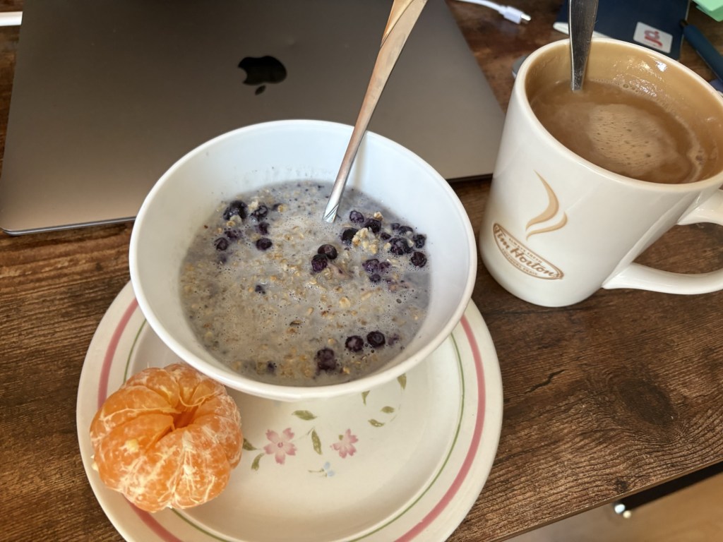 Frühstück am Schreibtisch mit morgendlicher Internetrunde und den täglichen Erledigungen. Dann ein Webinar um 12 und hinterher fleißige Schreibtischarbeiten, unterbrochen von Wäsche waschen und aufhängen (zweimal) und Paket entgegennehmen (auch zweimal, zwei verschiedene Dienstleister, jeweils auch mit einem Paket für die Nachbarn gegenüber, ich treffe also den Nachbarn auch direkt zweimal).
