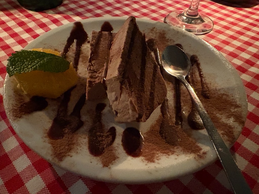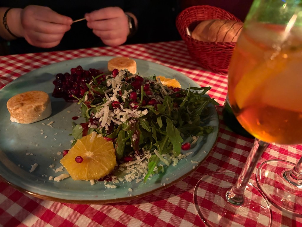 Am Ende bin ich genau rechtzeitig fertig, um mich pünktlich auf den Weg nach Fhain zu machen. Dort treffe ich im Stammitaliener des Bruders eben diesen, außerdem drei Cousinen, eine Tante und den Liebsten. Es gibt saisonale Leckereien, Aperol Spritz, Weißwein, Grappa (gleich zwei aufs Haus pro Person, man ist ja Stammkundschaft) und viel zu erzählen.