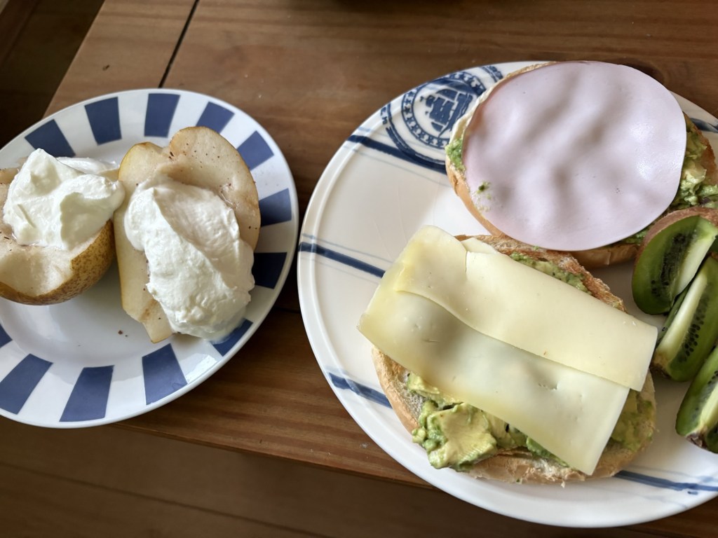 Ich drucke Dinge im Drogeriemarkt aus, hole ein paar Kleinigkeiten im Supermarkt und bevorrate mich im Haustierbedarf. Dann gibt es zuhause erstmal eine längere Pause auf dem Sofa, dazu Bagel mit Crowdfarming-Avocado und veganer Lyoner bzw. Gouda und eine gebackene Birne mit Joghurt und Zimt.