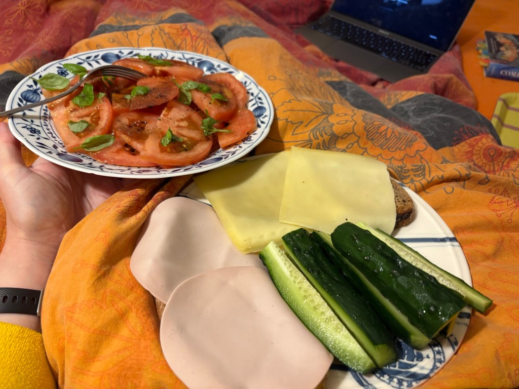Apropos Essen, mittags nachmittags gibt es die Reste vom Zucchini-Kartoffel-Eintopf von gestern. Später am Tag schaue ich eine Weihnachtsminiserie mit Rowan Atkinson, die bis auf einige Cringe-Momente, Logikfehler und zu vorhersehbare Missgeschicke insgesamt sehr nett anzusehen ist. Zum Abendbrot dann Stulle mit veganer Lyoner und Gouda, die erste Crowdfarming-Gurke und die erste Crowdfarming-Tomate, stilecht angemacht mit Olivenöl, Balsamico, Salz, Pfeffer und Basilikum.
