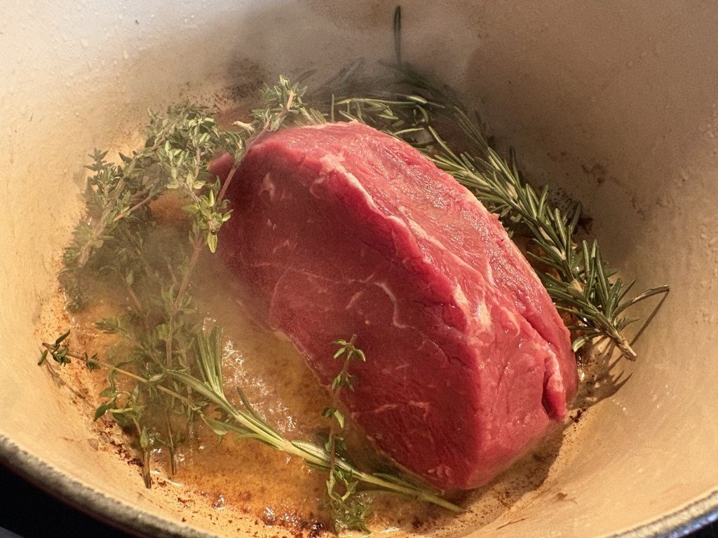 Danach geht es für die anderen in den Zoo zum traditionellen Weihnachtsbesuch samt Elefantenfütterung. Für mich geht es in die Küche, denn dieses Jahr (und vielleicht für immer) bin ich für das Weihnachtsessen zuständig – bzw. für weite Teile davon und die Direktive. Ich mache mir meine Weihnachtsplaylist an und lege los. Weil der Braten zu groß für den Bräter ist, muss ich ihn erst zerteilen. Dann wird in Butterschmalz angebraten.