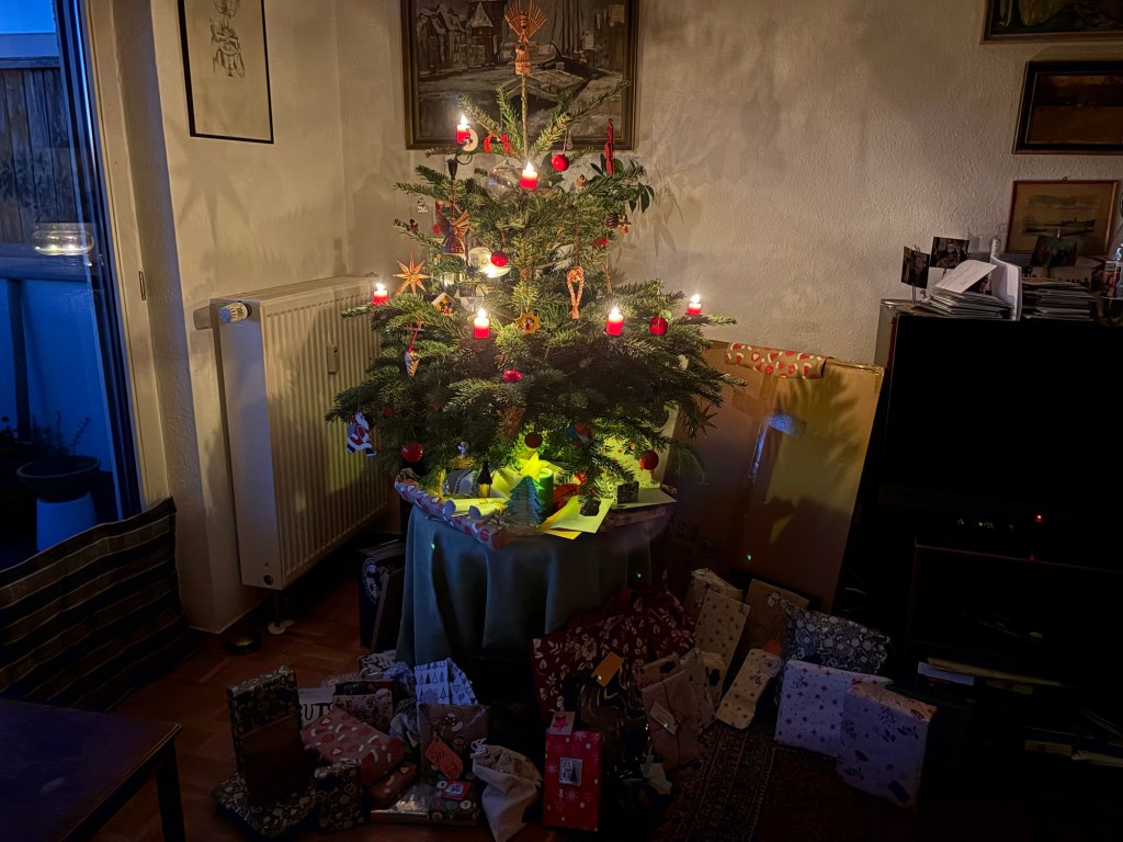 Wir singen „Ihr Kinderlein kommet“ und „Oh Tannenbaum“ und das Nifftenkind ist angemessen beeindruckt. Ich glaube aber, dass wir ab nächstem Jahr nicht mehr aufpassen müssen, wenn wir über Geschenke und Bescherung sprechen, es scheint zu ahnen, wo das alles herkommt.