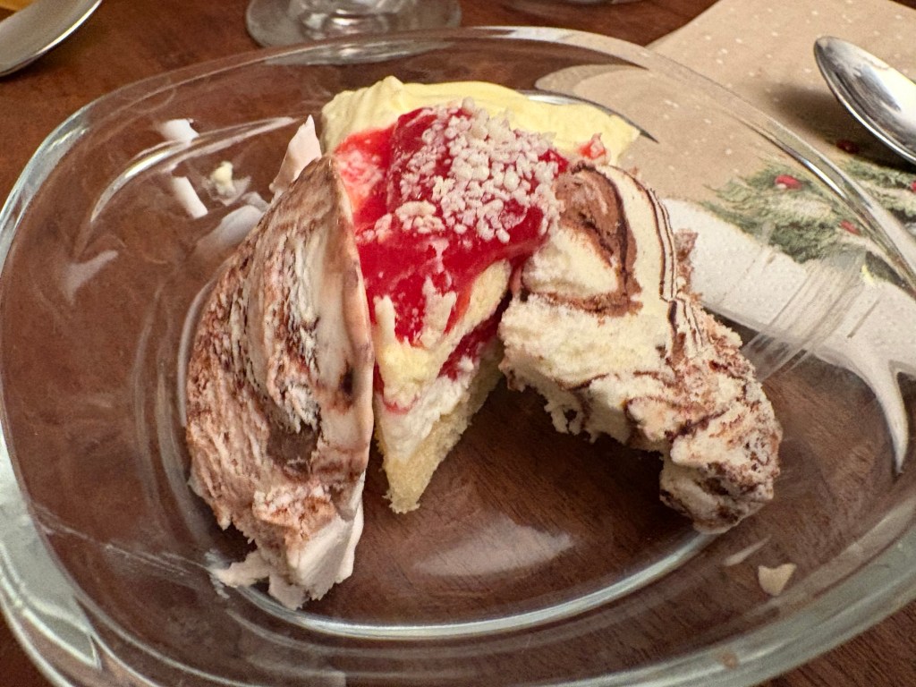 Dann ist es Zeit für Nachtisch – es gibt Spaghettieis-Torte und zwei Sorten Eis, außerdem Mandarinen.