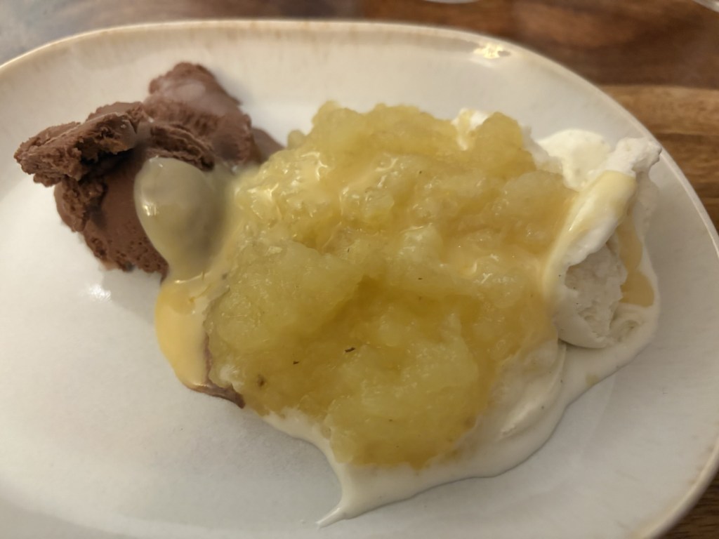 Zum Nachtisch gibt es brandenburgisches Eis (Belgische Schokolade und Madagaskar-Vanille) mit warmem Apfel-Tonka-Kompott und Eierlikör.