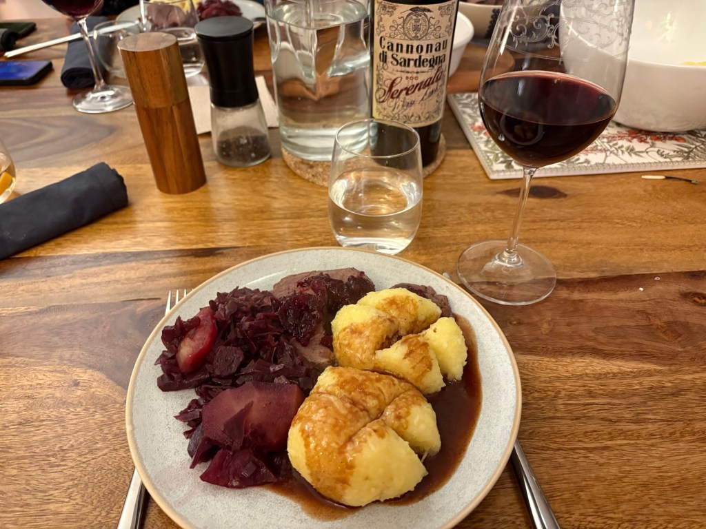 Wir hören Musik und erzählen bis der Braten die richtige Temperatur hat, dann gibt es Reh und/oder Ente mit Preiselbeeren, Klößen, Rotkraut und Sauce. Ich esse gute zweieinhalb Teller voll und höre dann nur aus Vernunftsgründen damit auf.