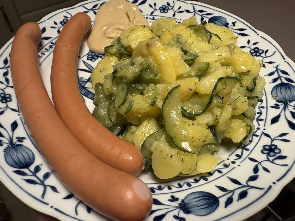 Nach dem frühen Feierabend dann endlich Kartoffelsalat, mit zwei Bio-Wienern und Dijon-Senf.
