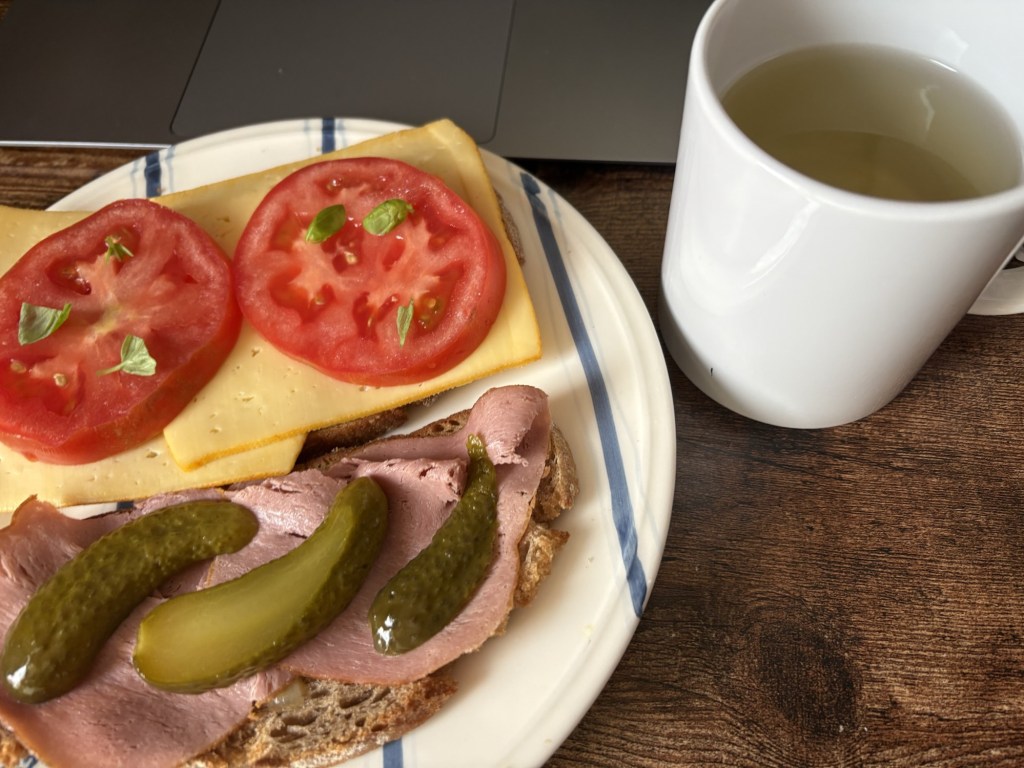 Wieder zuhause verräume ich alle meine Einkäufe und bereite mir dann einen Kartoffelsalat nach Omas Rezept für später zu. Der ist Weihnachten ausgefallen, weil ich ja dann doch nicht alleine in Quarantäne war und es dann keine Gelegenheit mehr gab. Als der fertig ist und abkühlt, bin ich bereit für Mittagessen. Es gibt Stulle, eine mit veganem Kochschinken und Spreewaldgurke und eine mit wokem Käse, Tomate und Basilikum. Dazu eine große Kanne Minztee mit frischer Zitrone. Mit allem geht es an den Schreibtisch.