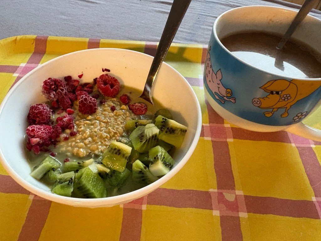 Heute ein Montag mit Wecker, wobei ich aber schon kurz vorher wach bin und so den gesamten morgendlichen Reboot schaffe. Grund für den Wecker ist ein Sportkurs. Ich stehe also früh auf, mache Kaffee und hole meine Matcha Overnight Oats (inspiriert von einem Rezept in NYT Cooking) aus dem Kühlschrank und werfe Kiwi und TK-Himbeeren drauf – schmeckt gut, ich werde mir demnächst auch mal warmes Porridge mit Matcha machen. Habe viel weniger Ahornsirup verwendet als im Rezept.
