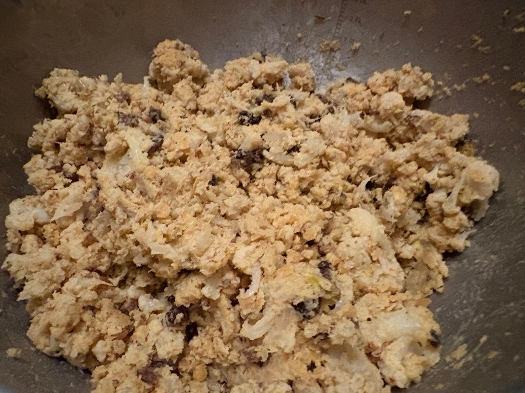Nach dem Frühstück wird der Jahresrückblick gebloggt, danach geht es in die Küche. Heute Abend fahren wir wie jedes Silvester seit ich den Liebsten in meinem Leben habe, mit zwei Jahren Pause wegen Corona, wieder zur gleichen Silvesterparty. Diesmal bin ich für das Buffet-Mitbringsel zuständig, weil der Liebste noch arbeiten muss. Es gibt also was aus dem Vorrat, denn meine Challenge macht auch vor Silvester nicht halt. Ich bastle den Blumenkohlsalat nach, den es bei einem der Workshops in diesem Jahr gab, muss aber einige Zutaten mangels Vorrat austauschen. Statt Kichererbsen also rote Linsen, statt Mango-Chutney eine Mischung aus Pflaumen- und Pfirsich-Chutney, statt gemischten Nüssen Pistazien. Das Koriandergrün muss ich ganz weg lassen, das ist neulich alle geworden. Schmeckt aber so auch alles sehr gut, aber wird viel matschiger aufgrund der Linsen, die nicht bissfest bleiben wollen.