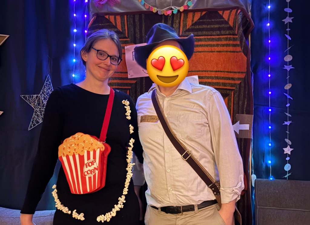 Wie jedes Jahr irren wir vor Ort ein bisschen herum, bis wir das richtige Haus bzw. die richtige Straße finden. Wie jedes Jahr weigern wir uns, uns die Adresse zu merken. Wie jedes Jahr werden wir freudig begrüßt und beziehen dann unser „Zimmer“, eine Nische im ersten Stock, die sonst zum Nähen bzw. Ankleiden verwendet wird und jedes Jahr mit einem Vorhang als unser Zimmer abgetrennt wird. Zu zweit schläft es sich da großzügig, zu dritt wird es alle zwei Jahre etwas enger, das Kind wächst ja. Heute aber alles easy. Wir ziehen uns um und posieren dann vor der Fotowand der Filmriss-Party.