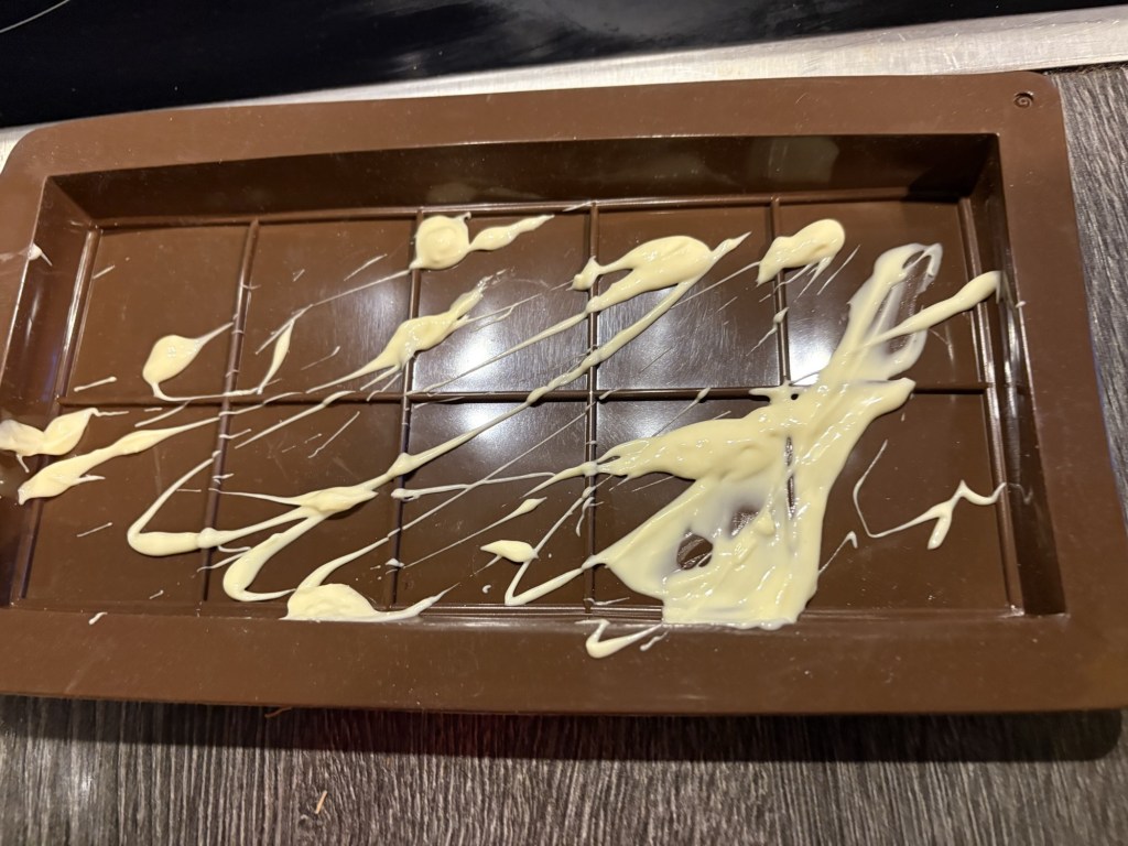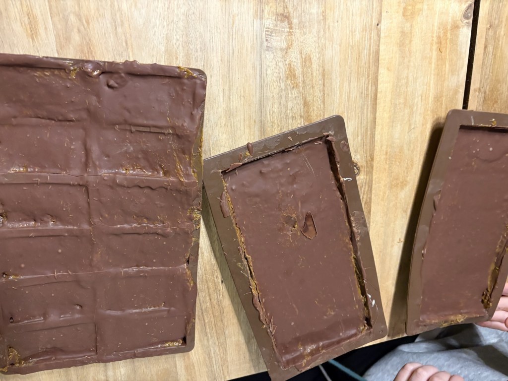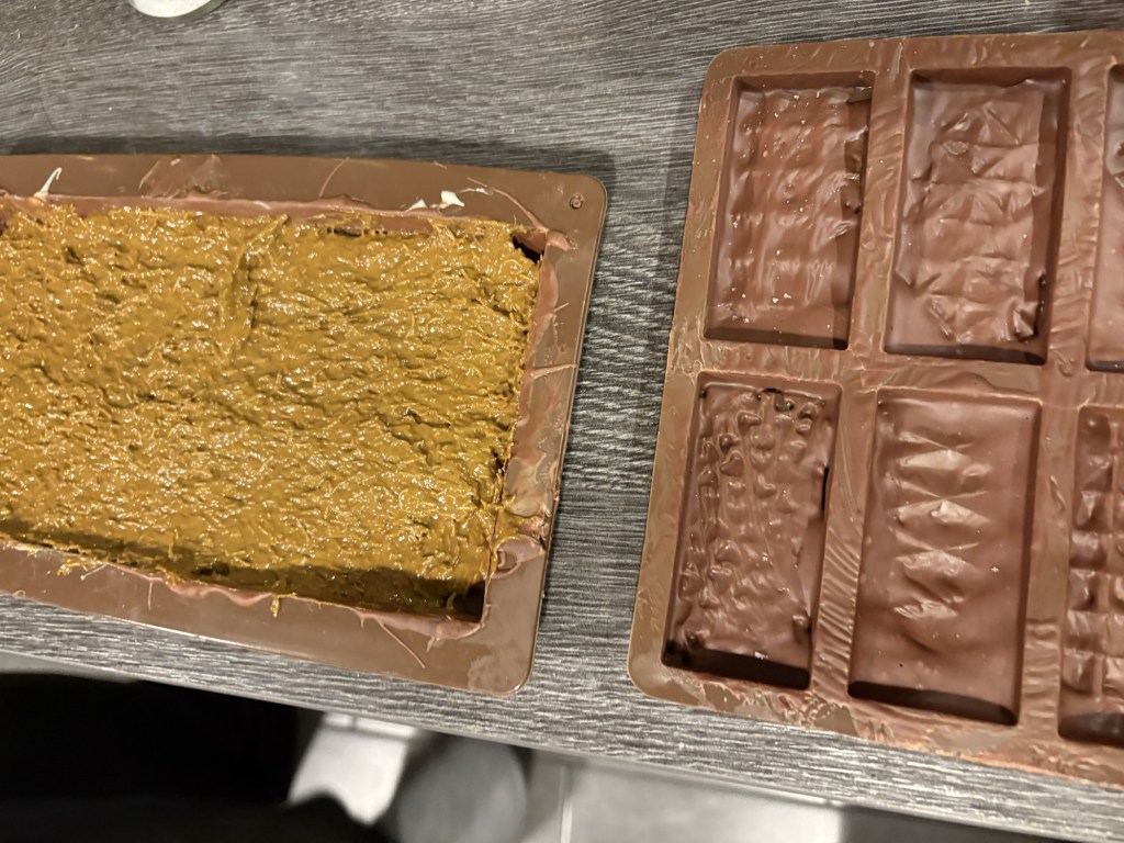 Als Nächstes kommt eine Schicht dunkle Schokolade in die Formen und wird gekühlt, dann kommt die Füllung drüber und eine zweite Schicht Schokolade oben drüber, bevor wieder gekühlt wird.