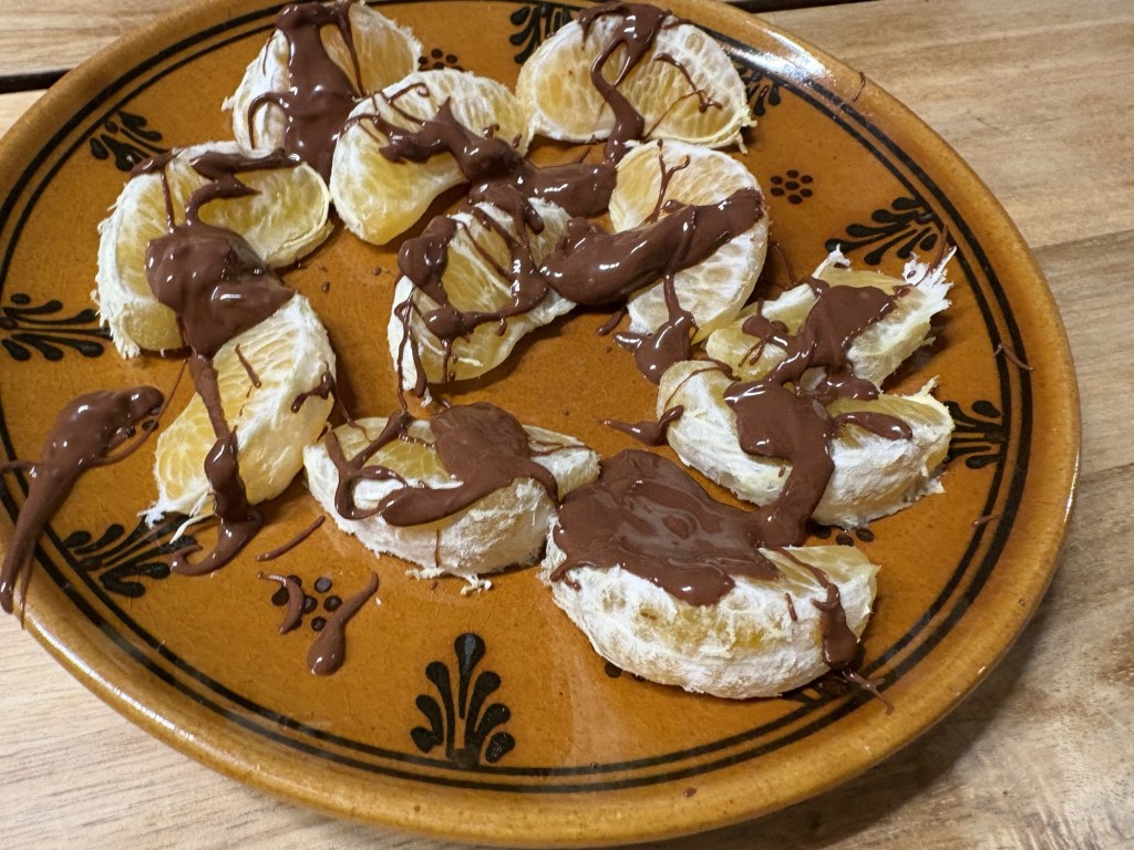 Mit der übrigen Schokolade dekoriere ich eine Mandarine, soll ja keiner sagen, wir würden uns nicht gesund ernähren.
