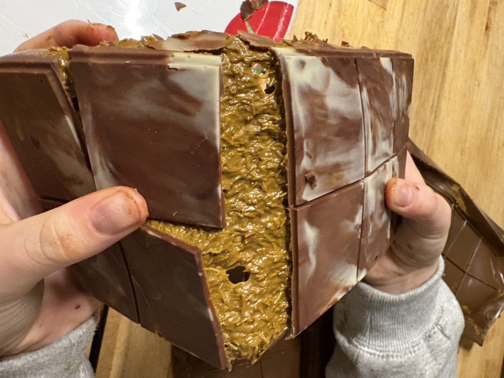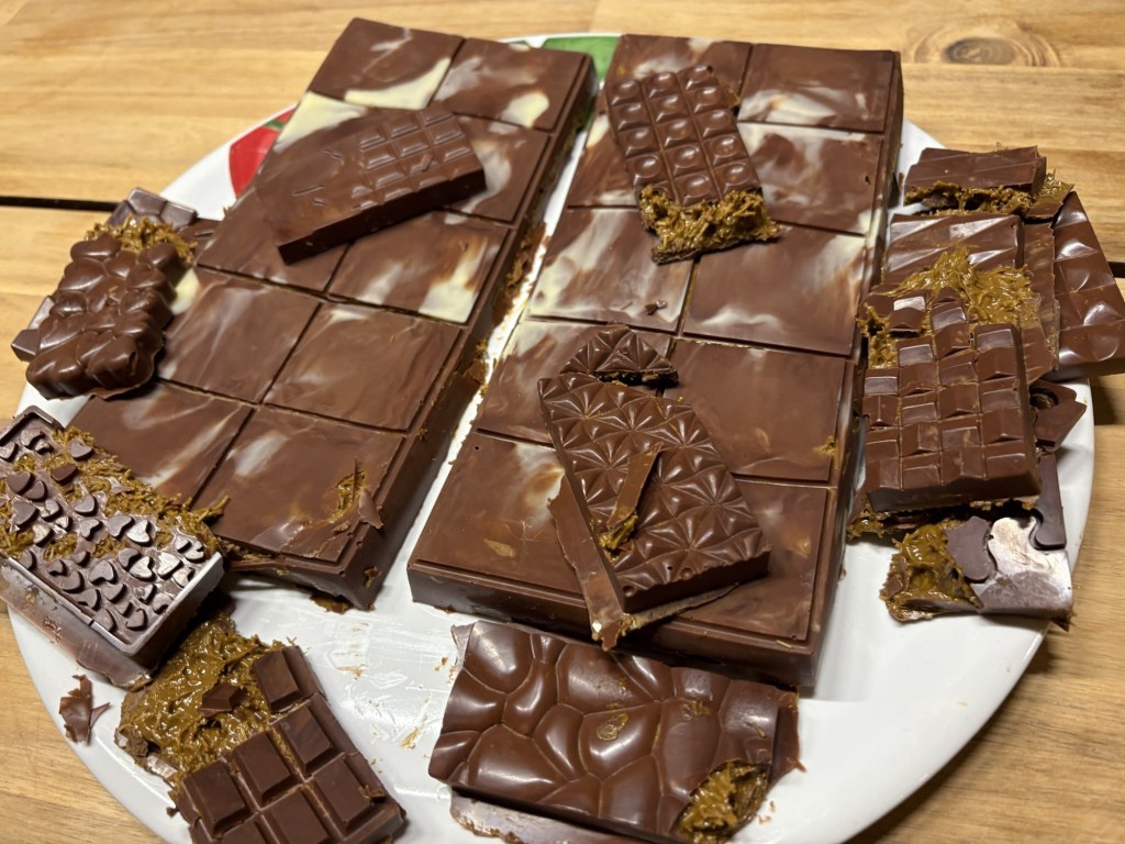 Wir stellen fest, dass die kleinen Tafeln sich besser für ohne Füllung eignen, die großen aber ganz hervorragend geworden sind. Und wir stellen fest, dass das alles ganz schön süß und mächtig und lecker ist. Wir naschen nur ein bisschen und wickeln den Rest dann ein und lagern ihn im Kühlschrank.