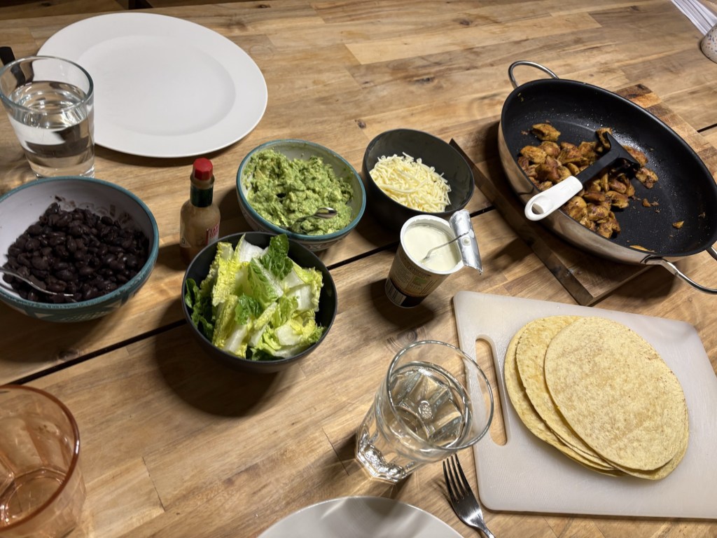 Danach brauchen wir auch dringend etwas herzhaftes und ich bereite alles für Tortilla Wraps vor – Mais-Weizen-Tortillas, Avocado-Creme, Salat, schwarze Bohnen, veganes Hähnchen mit Zitrone, Schmand, Mozzarella und Tabasco. Der Einkauf hier ist ja legal, aber ich kann ihn ja auch nutzen, um dann Dinge zu essen, die mir zuhause bald fehlen würden und mir so das Durchhalten erleichtern…