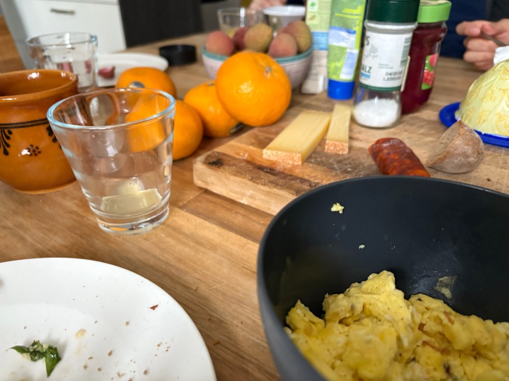 Es gibt Ei, Börek, Brot, Aufstriche, Käse, Wurst, Snickers Spread und auf meinen Wunsch Litschis, Mandarinen und eine riesige Blutorange, dazu O-Saft, Tee und Kaffee. Und es gibt jede Menge Kennenlerngespräche – das Leben in Berlin, in Dänemark, Estland und Südkorea, Serien, Politik und vieles mehr. Ein sehr internationales Mahl.