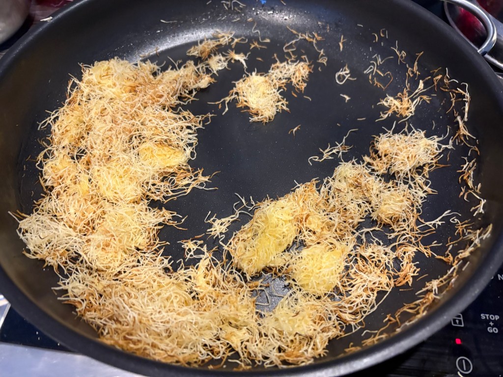 Zuerst schneiden wir Unmengen Kadayıf ein und braten es in Butter an. Einen Teil brauchen wir für die Schokolade, den Rest frieren wir für zukünftige Kunafa ein. Dann schmelzen wir weiße Schokolade und sind schon ein bisschen dekorativ mit den Formen, die danach kurz in den Tiefkühler wandern, während wir die erste Hälfte dunkle Schokolade (Zartbitter und Vollmilch im Verhältnis 1:3) schmelzen und das Pistazienmus (100 % Pistazie, wenn schon denn schon) mit dem Kadayıf und geben noch den Rest weiße Schokolade und ein Päckchen Vanillezucker dazu, weil das Teilzeitkind Sorge hat, dass es nicht süß genug werden könnte.
