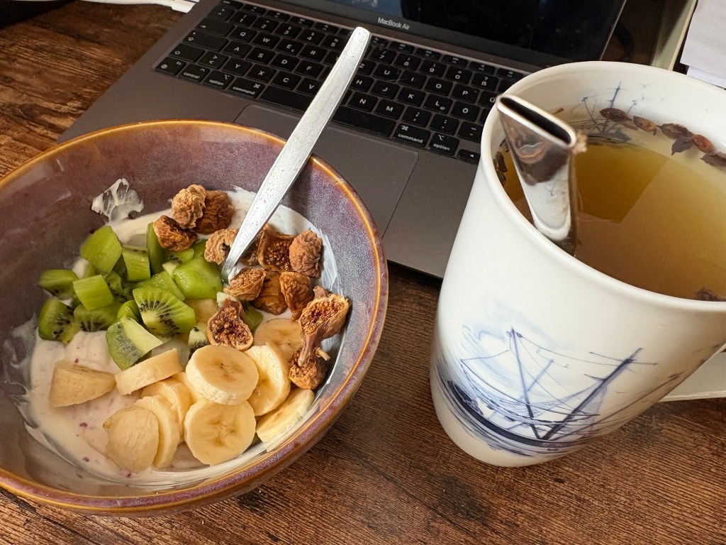 Die Katzen bekommen ihr Frühstück, dann auch ich. Es gibt einen Rest Quark mit einem Rest Johannisbeergelee, die vorletzte kanarische Banane, eine Kiwi und eine Handvoll getrocknete Wildfeigen, dazu schwarzen Tee mit Yuzu.
