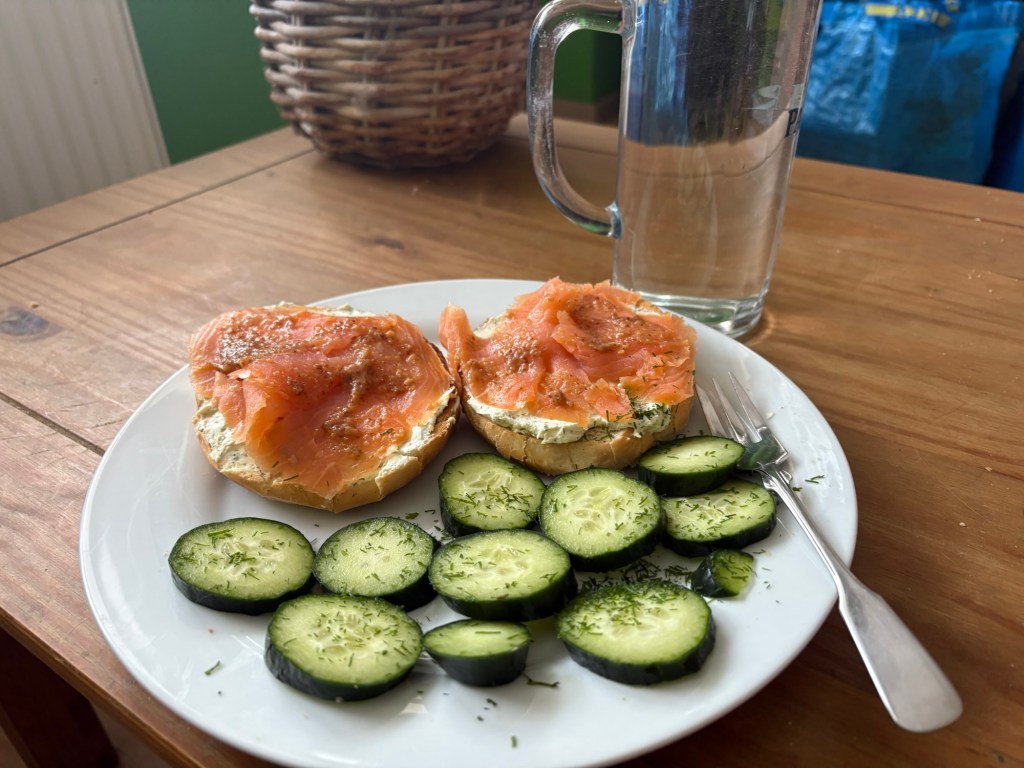 Dann ist auch schon Mittagszeit. Es gibt einen Bagel mit Kräuterfrischkäse, Räucherlachs und süßem Senf, dazu die vorletzte Gurke mit Dill und Wasser mit Holunderblütensirup.