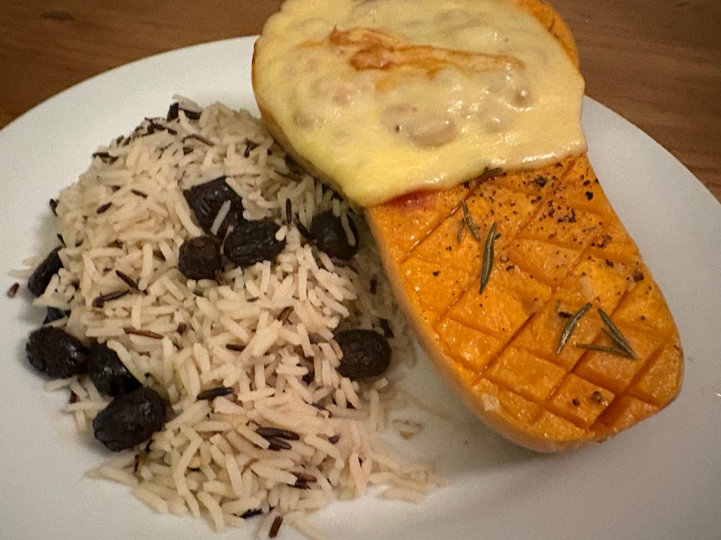 Feierabend ist dann gegen 18 Uhr und der führt mich direkt wieder in die Küche. Heute gibt es die zweite Hälfte vom gestrigen Butternut-Kürbis – im ganzen geröstet, mit Öl, Knoblauch und Rosmarin, gefüllt mit Baked Beans und am Ende mit Käse überbacken, dazu Basmati- und Wildreis mit getrockneten Cranberries – ein insgesamt recht indigen amerikanisches Essen. Deshalb unterlege ich den dazugehörigen Insta-Post zu meiner #loosyisstdiekücheleer-Challenge (keine neuen Lebensmittel gekauft seit 20.12.) auch mit passender Musik von Northern Cree.