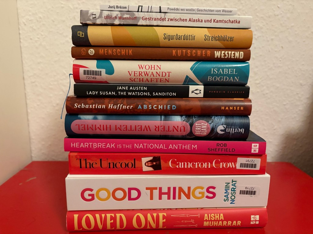 Nach einer guten Stunde fahren der Liebste und ich nach Zehlendorf, das Kindelein wieder abholen. Auf dem Heimweg steigen die Beiden dann an ihrer Station aus und ich fahre weiter, zurück in den Norden. Im Pberg angekommen versorge ich die Katzen, mache mir Reisbandnudelsuppe von gestern warm und versenke mich dann wieder ins Buch, aber nicht, ohne vorher ein Foto aller meiner Weihnachtsbücher zu machen.