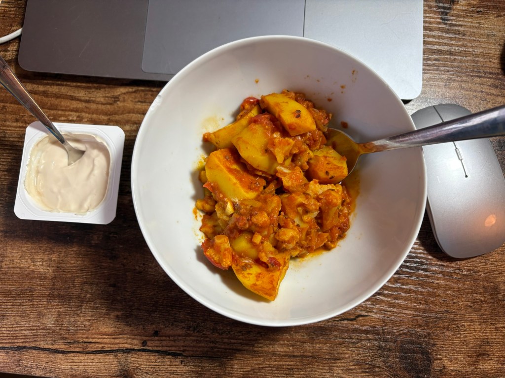 Danach die obligatorische erste Einheit am Schreibtisch, bevor ich mich um das Katzenklo kümmere, bevor ich mich in die Badewanne lege. Mit nassen Haaren dann zweite Schreibtischrunde und ein Webinar. Zum Mittagessen gibt es dazu den Rest des Aloo Gobhi und einen letzten Pudding.