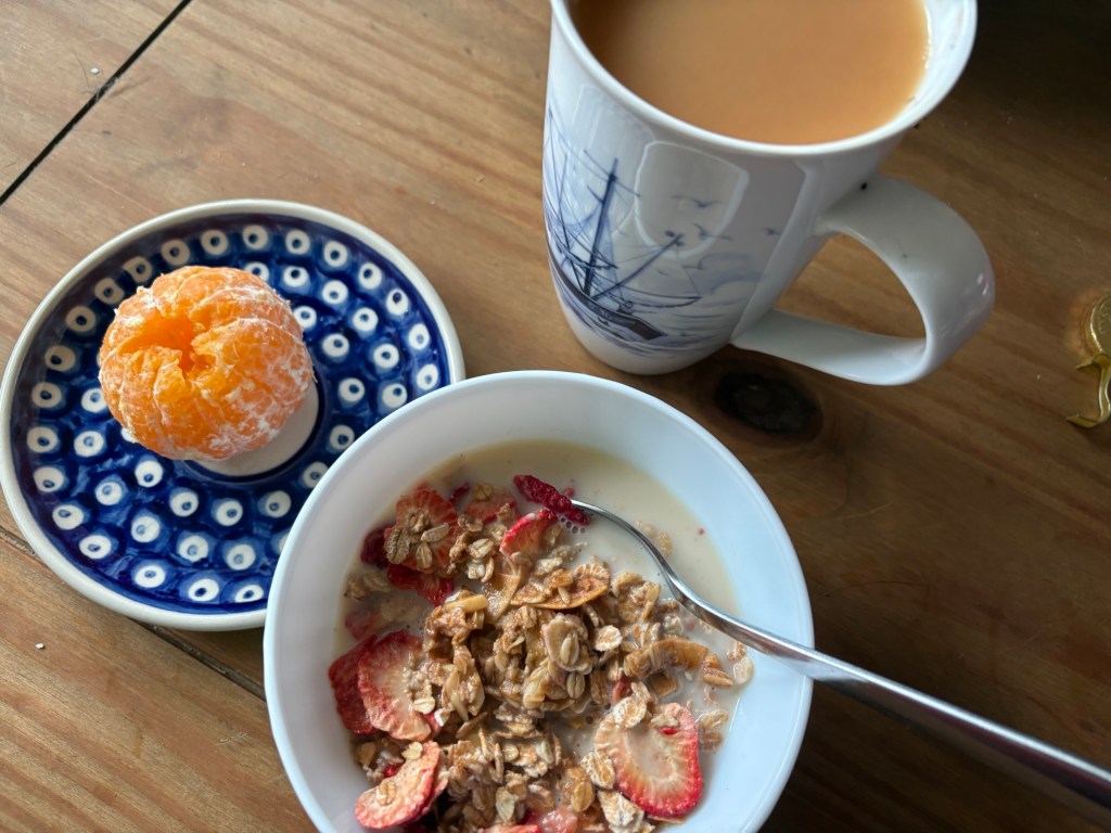 Achja, Frühstück ist heute Erdbeer-Müsli mit Ostfriesentee und Mandarine. Es kommt außerdem die Nachricht, dass sich die Obstkiste verspätet, ich werde also nicht mit Frischobst hinlangen, bis das soweit ist.