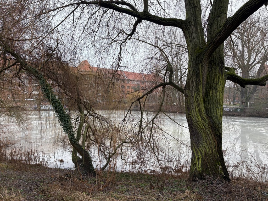 Dann Duschen, Anziehen, Wasserflasche schnappen (Schleimhäute!) und hinaus in den Wintertag. Der Großteil von Schnee und Eis scheint weggetaut, der Anschein trügt aber, sobald ich den dicht besiedelten Bereich verlasse. Warm ist es trotzdem ziemlich, ich brauche weder Mütze, Schal noch Handschuhe. Ich laufe durchs Neubaugebiet zu den Schrebergärten, wo es teilweise schon ordentlich schlittrig ist, dann ein Stück durch den Park, aber nur ebenerdig, die Wege sind Eis mit Wasser oben drauf.