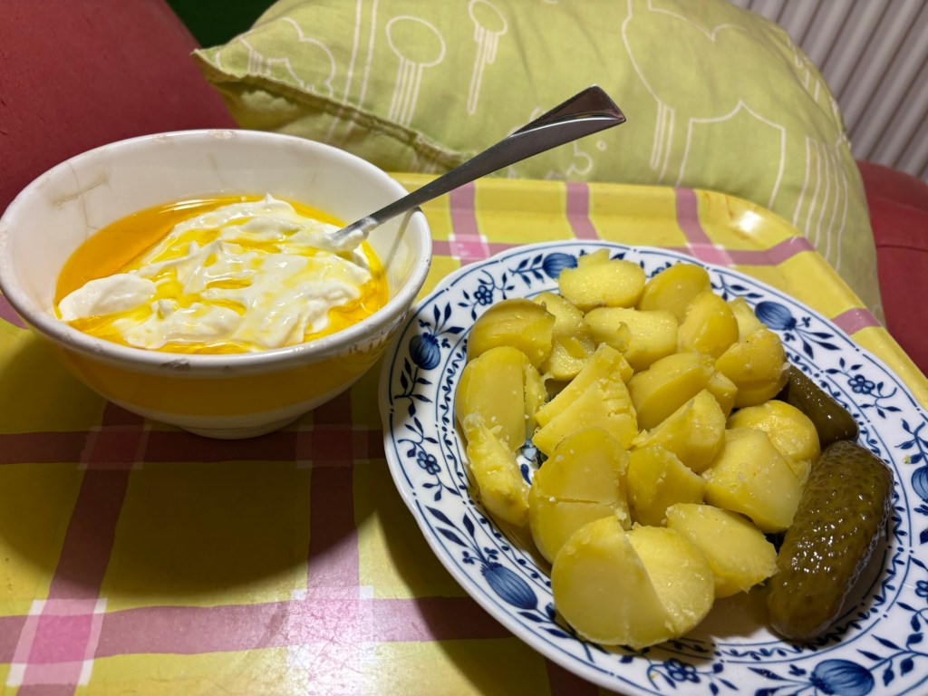Omega-3 hat auch das Leinöl zum Quark, außerdem esse ich die letzten Spreewaldgurken auf. Jetzt habe ich kein schnelles Snack-Gemüse mehr, alles was noch da ist, bedarf der Zubereitung. Aber ich habe ja auch immerhin schon seit 26 Tagen nicht eingekauft, da darf das auch so sein.