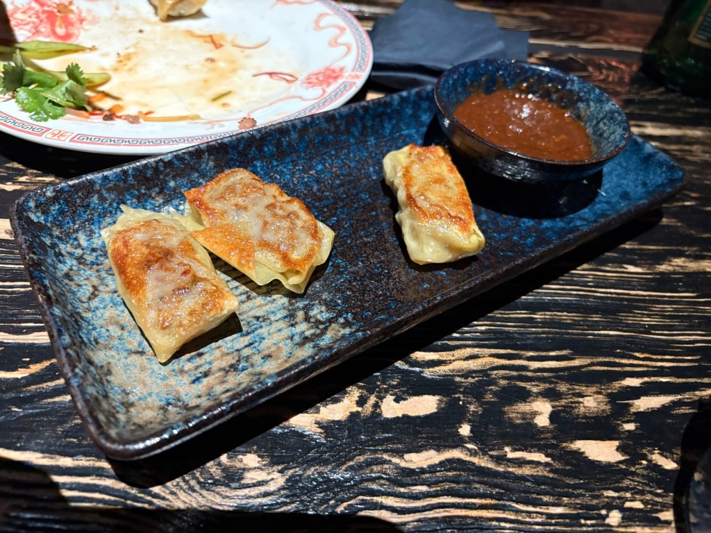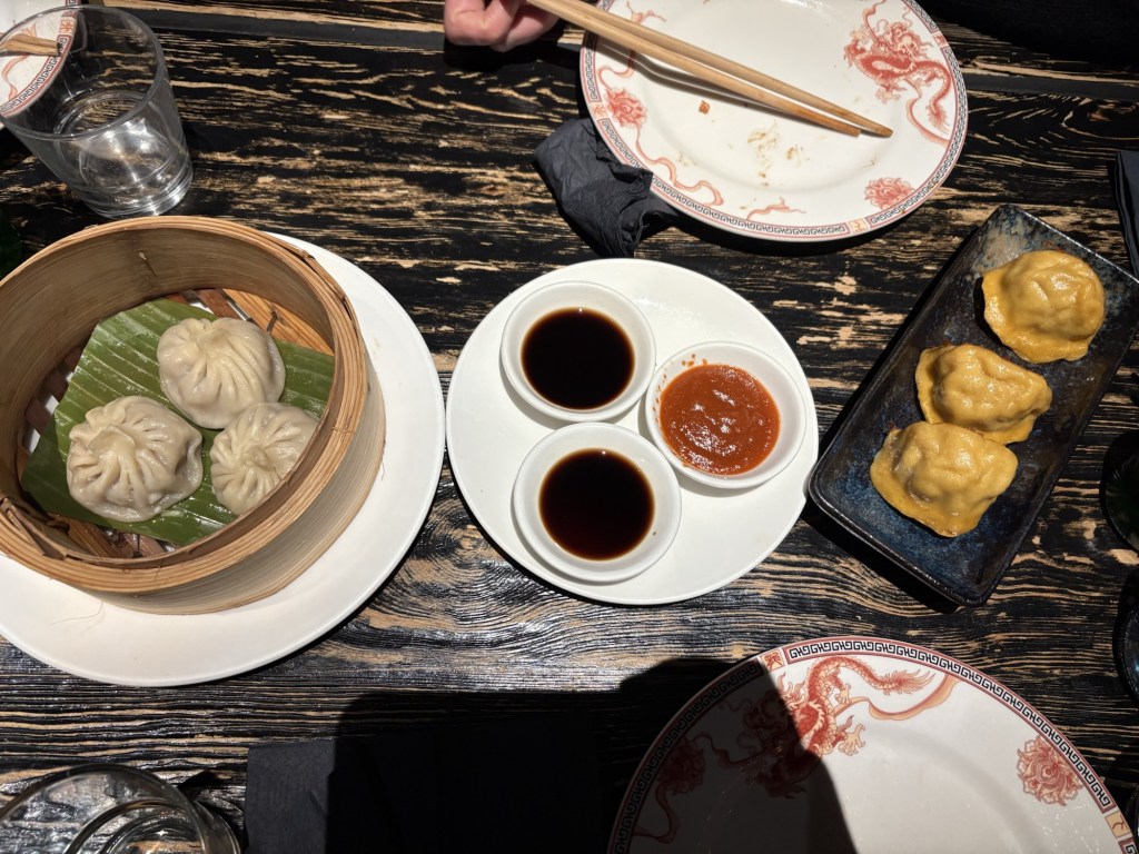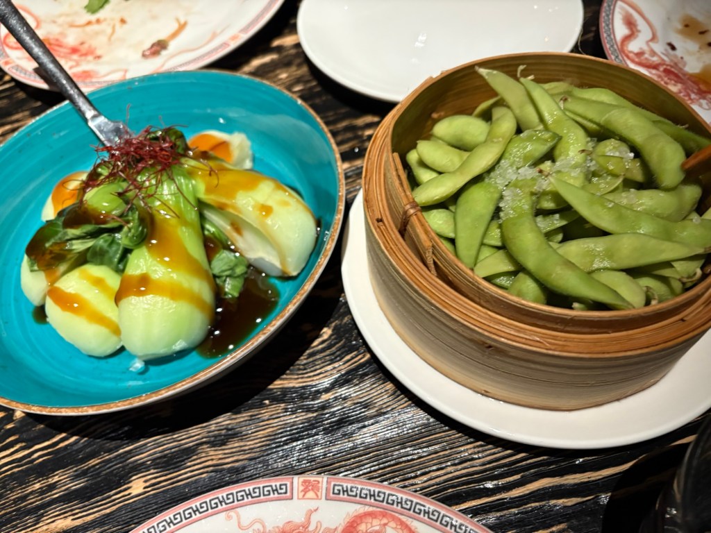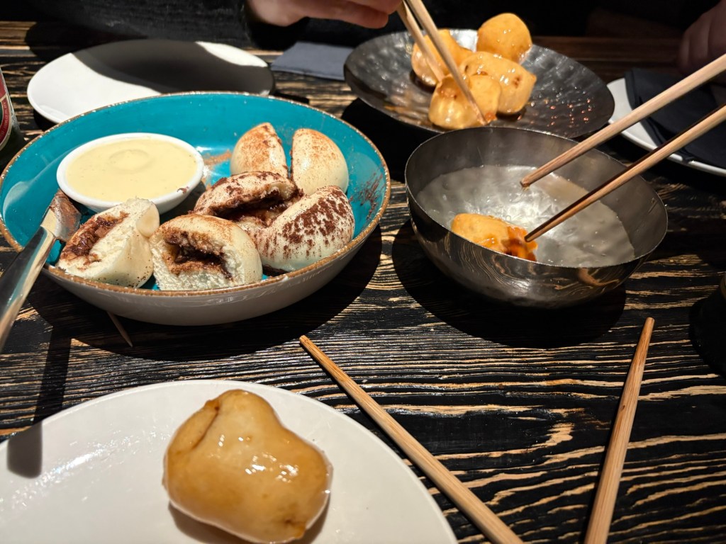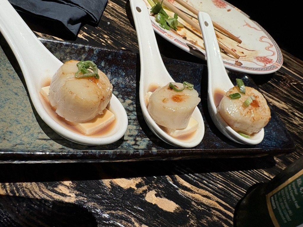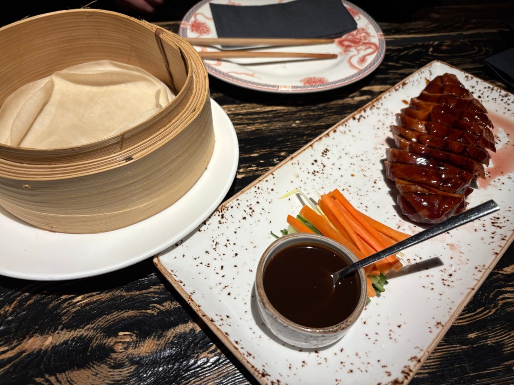 Am Anfang essen wir mit viel Elan alles auf, ab den Frühlingsrollen fällt das langsam schwerer. Bei den Jakobsmuscheln (ich esse zwei) fragt mich der Liebste, wie mein Histaminfüllstand ist. Erst da fällt mir auf, dass die Kombi aus viel fermentiertem, Meeresfrüchten, Zitrus, Alkohol, Kohlensäure und generell viel Essen vielleicht gar nicht so gut ist. Von der Peking-Ente und den Dumplings koste ich dann jeweils nur noch vorsichtig. Beim Dessert übernimmt dann allerdings der Zweitmagen und ich kann nochmal richtig zuschlagen.