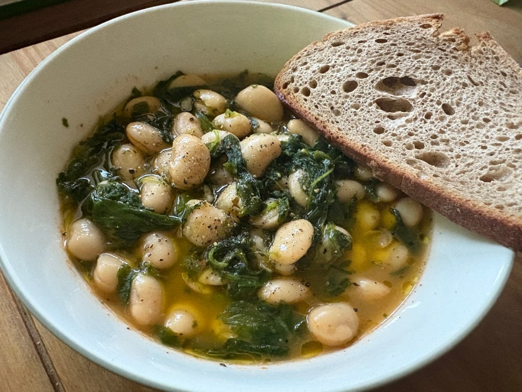 Hinterher etwas Gewusel – Müll wegbringen, nach der Post gucken (noch nicht da) und dann erstmal Mittagessen kochen. Ich mische TK-Spinat und Dosenbohnen, koche beides in Acqua Faba mit Parmesanrinde und etwas Tomatenmark und gebe dann Zitrone, Pfeffer und Olivenöl oben drauf, dazu eine Scheibe Brot – sehr leckeres, gesundes, ausgewogenes Mittagessen und eine Portion für morgen bleibt auch übrig.