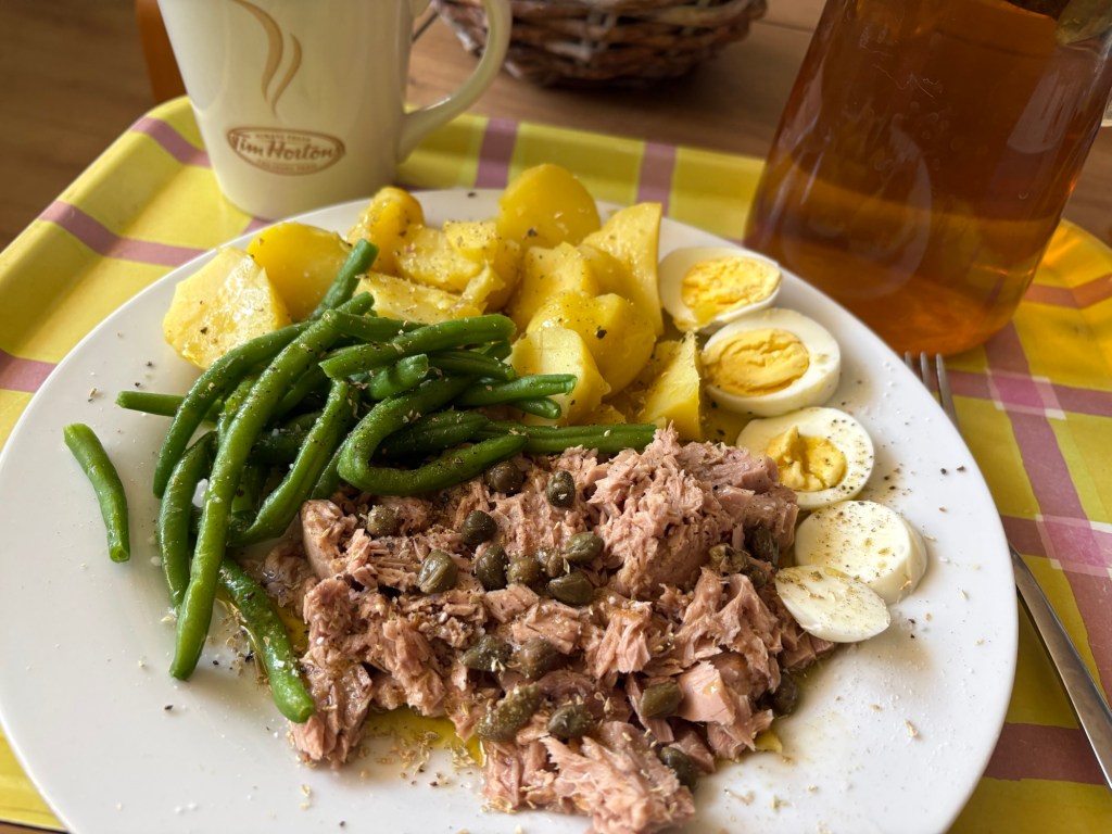 Dort ist erstmal Zeit für Essen, ich habe Hunger mitgebracht und mache mir aus Kartoffeln, Bohnen, letztem Thunfisch und letztem Ei einen Salat, der gebürtig irgendwo zwischen Nizza und Sizilien angesiedelt sein muss. Verfeinert wird er mit Kapern, Oregano, Zitrone, Olivenöl, weißem Balsamico und natürlich Salz und Pfeffer. Dazu Minztee. Die Katzen freuen sich über die leere Thunfischdose.