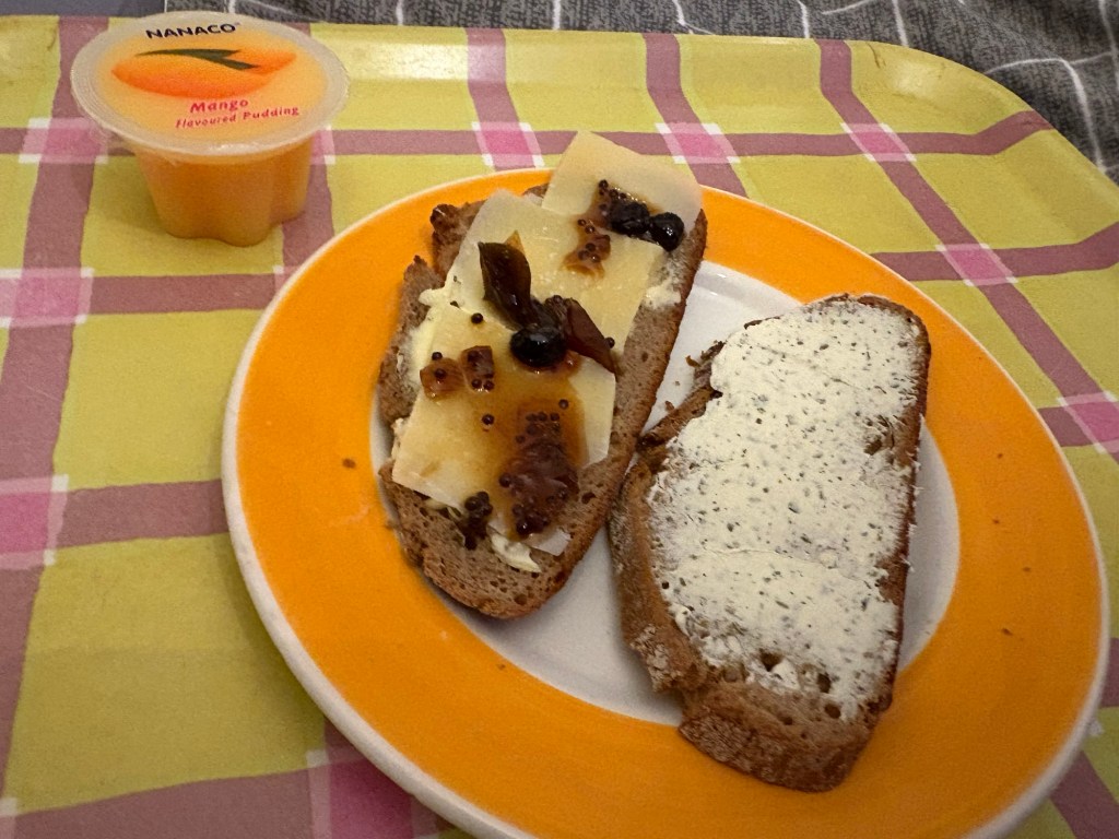 Relativ früh bekomme ich dann auch schon wieder Abendbrothunger, aber nur so wenig, dass ich nichts koche, sondern Stullen improvisiere – eine mit Kräuterfrischkäse und eine mit Butter, Bergkäse und Pflaumen-Chutney. Damit es nicht zu langweilig wird, gibt es noch einen Mangopudding hinterher.