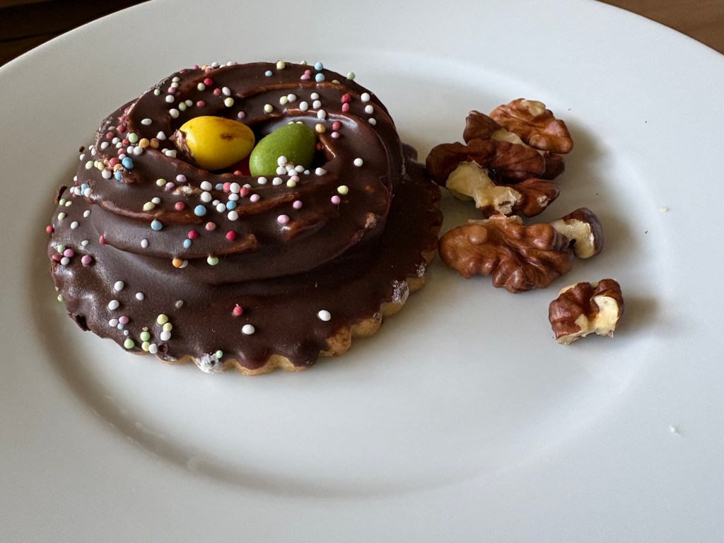 Wieder zuhause gibt es das letzte Vogelhochzeitsnest und ein paar Walnüsse, dazu einen Sencha. (Technisch gesehen habe ich die Vogelhochzeitssachen auch gar nicht gekauft, wo bleibt meine Rechnung?)