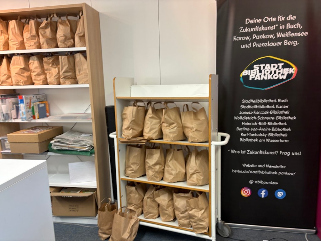 Ich fleißele vor mich hin, bis ich gegen Mittag erst ein Webinar und dann ein Meeting habe, für das die Kamera an sein und ich mich also in Schale werfen muss. Das erlaubt mir dann aber auch, direkt danach rauszugehen und eine Erledigungsrunde zu drehen. Die Sonne sonnt, es ist kalt. Ich gehe einen Brief bei einer Behörde einwerfen, das geht deutlich schneller als mit der Post und kostet statt Porto nur Schritte, und kehre dann bei der örtlichen Bibliothek ein, in der heute welche von den 4000 Tonnen Kartoffeln für Berlin verteilt werden. Jede*r nur eine Tüte, keine Selbstbedienung!