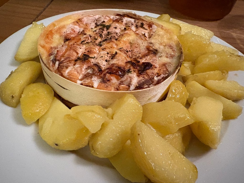 Ich mache mir früh Abendbrot, wärme die Kartoffeln von gestern auf und backe dazu eine Ofenkäse, den ich auf Geheiß des Foodie-Internets vorher mit Knoblauch, Zitronenschale, Thymian, Pfeffer und Weißwein (hier stattdessen Sherry, wegen Challenge) aufpeppe. Sehr gut, nächstes Mal noch mehr Zitrone!