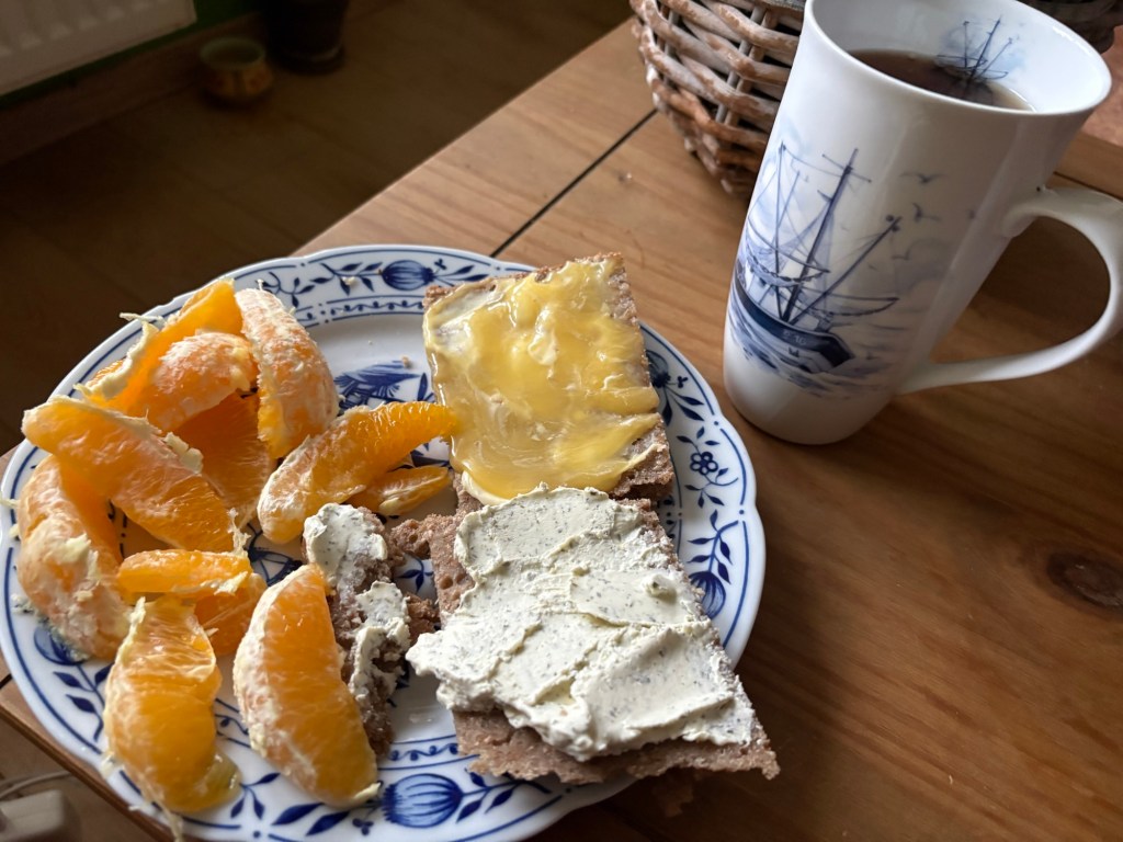 Ein Montag mit Ausschlafen, das passt ganz gut nach der Feierei am Wochenende. Gerade noch rechtzeitig mit dem Liebsten telefoniert, bevor er in einen anstrengenden Arbeitstag startet und dann erstmal in Ruhe den morgendlichen Reboot absolviert. Zum Frühstück dann von dem experimentellen Brot von gestern – mit Kräuterfrischkäse bzw. Butter und Honig und dazu eine Crowdfarming-Apfelsine und Earl Grey.