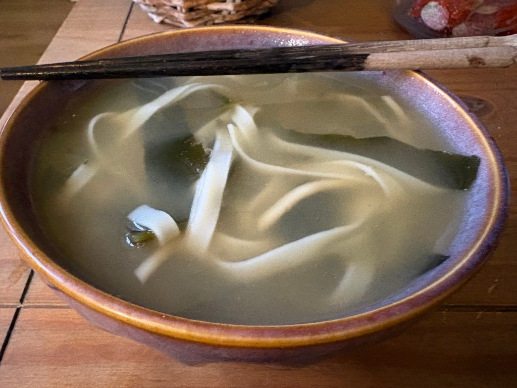 Nach der ersten Schreibtisch-Schicht lege ich eine Runde Haushalt ein, während die Mitbewohnerin putzt, und mache mir dann die algenbasierte Brühe von gestern wieder heiß, diesmal gibt es Reisnudeln dazu statt der Weizennudeln von gestern. Spannend: Die Algen machen ordentlich Schaum beim Kochen.