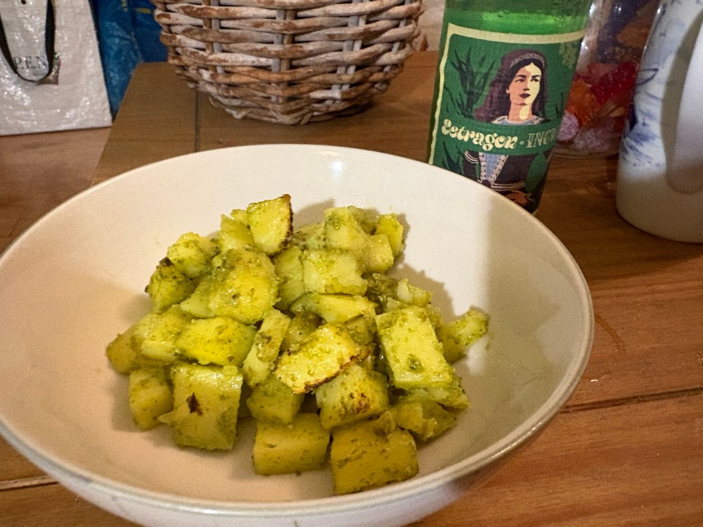 Dann ist nochmal Webinar, das aus Gründen sehr skurril ist. Nebenbei wärmt sich mein Abendessen im Ofen. Es gibt die ersten der 4000 Tonnen Kartoffeln für Berlin, die ich vor dem Backen mit meinem Bärlauch-Orangen-Mandel-Pesto von letztem Frühling vermischt habe. Schmeckt sehr gut! Dazu eine Estragon-Ingwer-Limo.