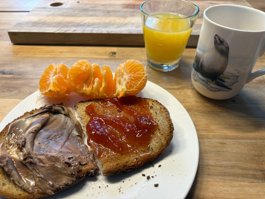 Zum Frühstück dann Kaffee, O-Saft, Mandarine, Brot mit Snickers Spread, Brot mit Erdbeermarmelade