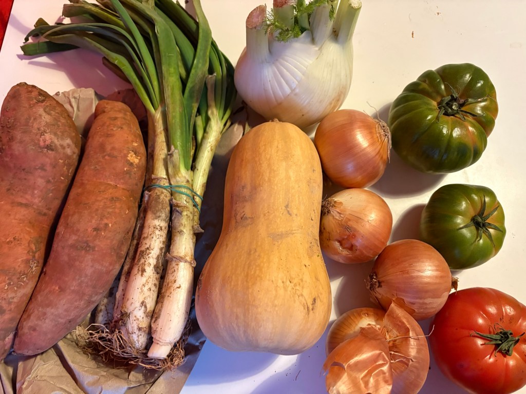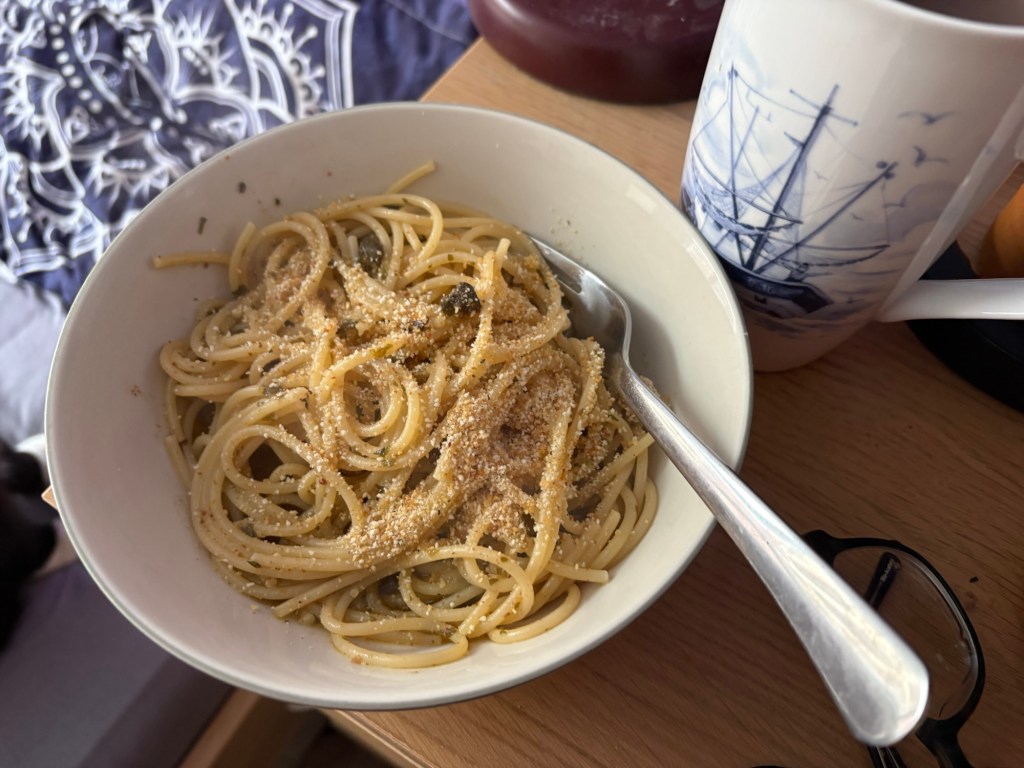 Am Nachmittag koche ich mir Pasta mit Anchovis, Knoblauch, Kapern, Bottarga, Petersilie und Zitrone, dazu geröstete Semmelbrösel. Kurz danach kommt die Gemüsekiste an – einen Tag zu früh und wieder in anderer Zusammensetzung als angekündigt. Es fehlen Kohlrabi, Gurken und Kohl, dafür gibt es Fenchel.