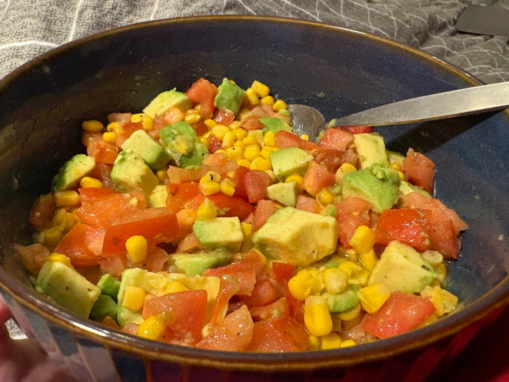 Zum Abendbrot gibt es die reife Tomate aus der Kiste mit der vorletzten Avocado, dem Rest Dosenmais und einem Limettendressing. Dieses Wochenende halte ich meine Keine-Lebensmittel-nachkaufen-Challenge noch durch, aber ich denke am Montag oder spätestens Dienstag werde ich dann doch mal wieder in den Supermarkt gehen. Ich könnte noch eine ganze Weile von Nudeln mit Ketchup, Asianudeln mit Algenbrühe, verschiedenen Gemüsekombinationen und Süßkram leben, aber ich brauche für die Abwechslung und das Wohlbefinden auch wieder (vegane) Milchprodukte, (vegane) Fleisch- und Fischprodukte, Müsli und frisches Obst – die letzte Kiste und schon fast wieder aufgegessen. Ich werde aber mit Bedacht nachkaufen und trotzdem gucken, dass ich weiter Dinge aufbrauche.