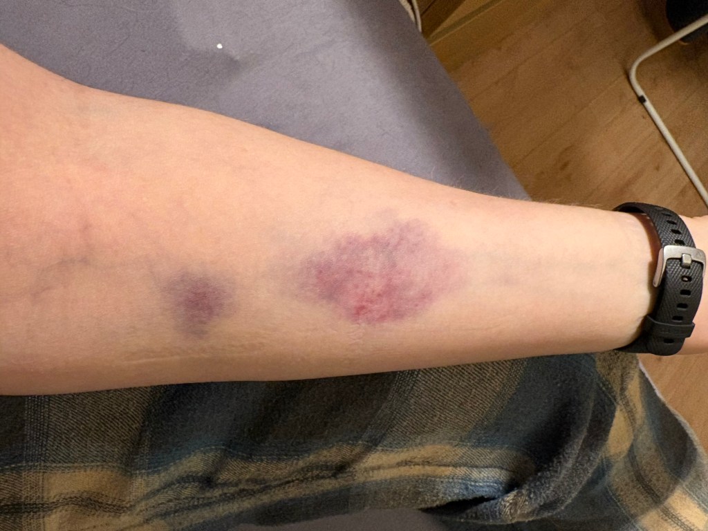 Vor dem Einschlafen mache ich noch ein Erinnerungsfoto vom Arm, der nach dem gestrigen Sturz wohl den Höhepunkt an Bluterguss erreicht hat, und eins vom Knöchel, zu Dokumentations- und Vergleichszwecken – das zeige ich aber nicht, es gibt ja Menschen mit Fußphobie…