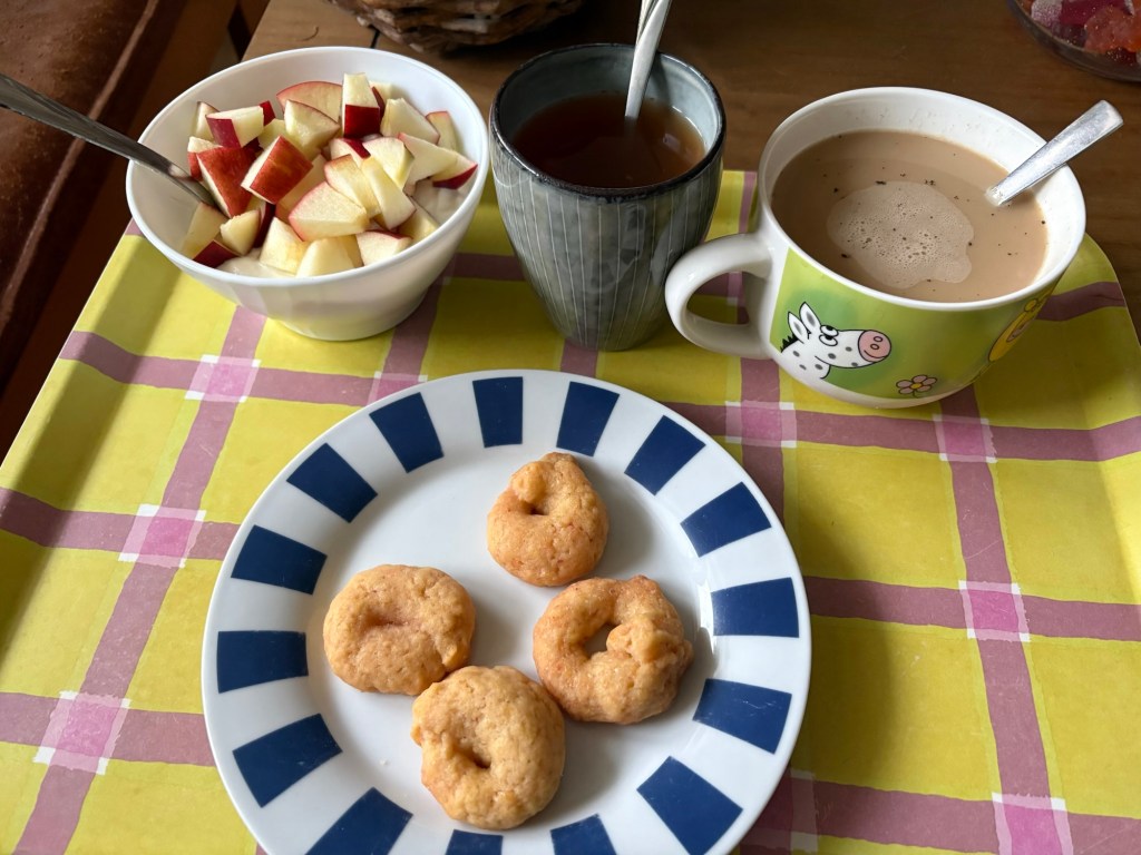 Zu angemessener Zeit erwacht, den morgendlichen Reboot komplett am Stück im Bett erledigt, dann die Katzen versorgt und erstmal Chai gekocht – in dem Fall mit frischem Ingwer und Kurkuma, Erbsenmilch, Honig und schwarzem Pfeffer. Währenddessen den Rest vom Frühstück angerichtet:
