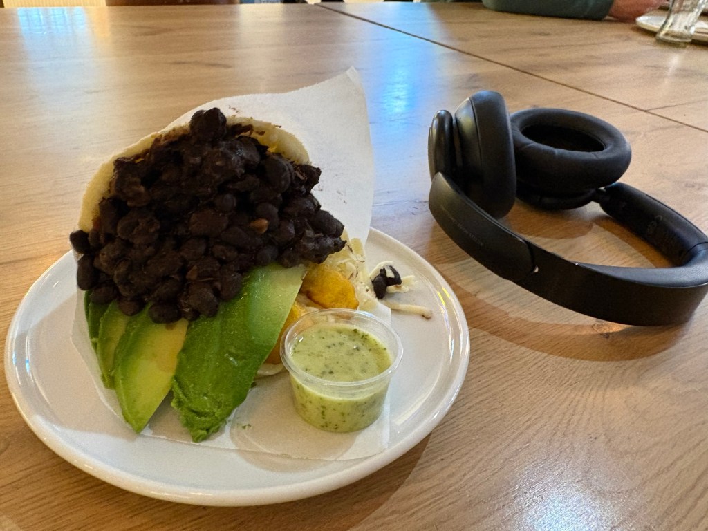 Und schon habe ich Mittagshunger, das kommt vom frühen Wachwerden. Im nahe gelegenen Foodcourt gönne ich mir eine venezolanische Arepa mit Avocado, schwarzen Bohnen und Kochbanane – mal wieder sehr dem Zeitgeist angepasst, wobei das Venezuela-Thema ja schon wieder drei Nachrichtenzyklen hinter uns liegt.