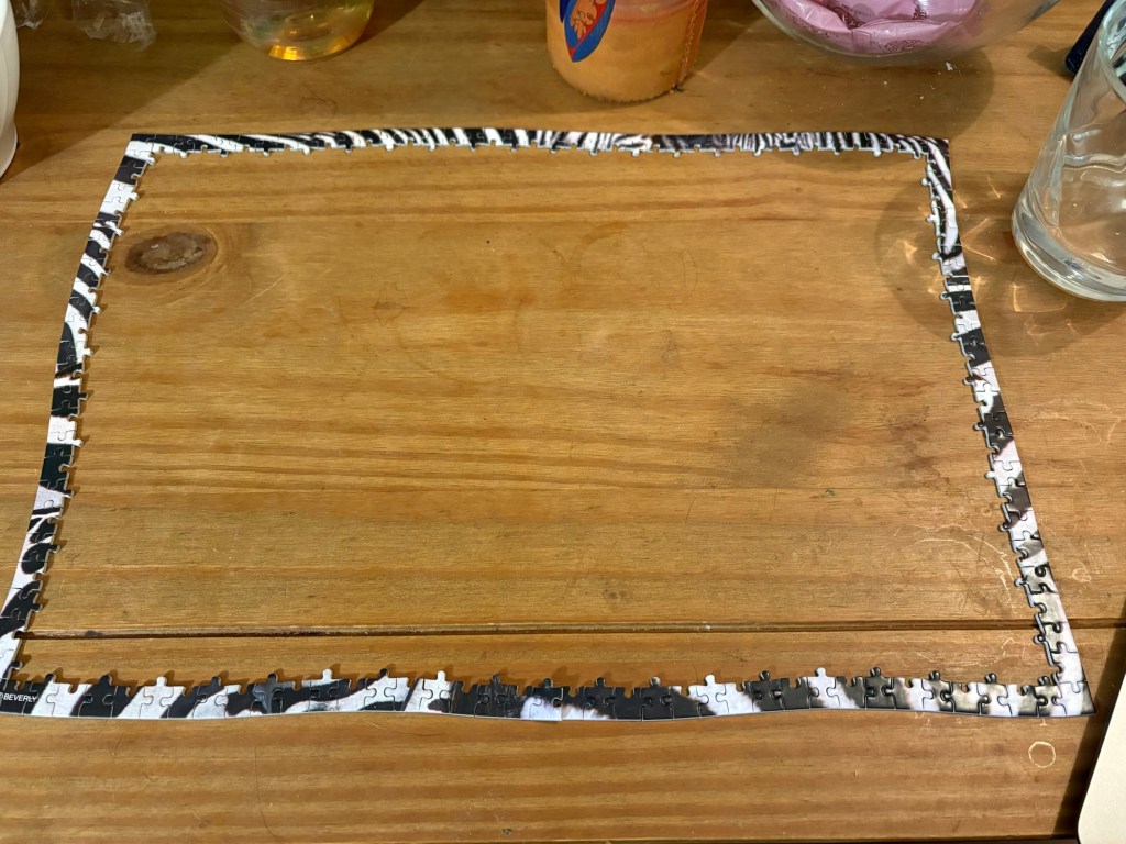 Nebenbei fange ich dann noch das Puzzle an und habe zu Spielende um Mitternacht (ich gucke zeitversetzt) immerhin den Rahmen fertig…