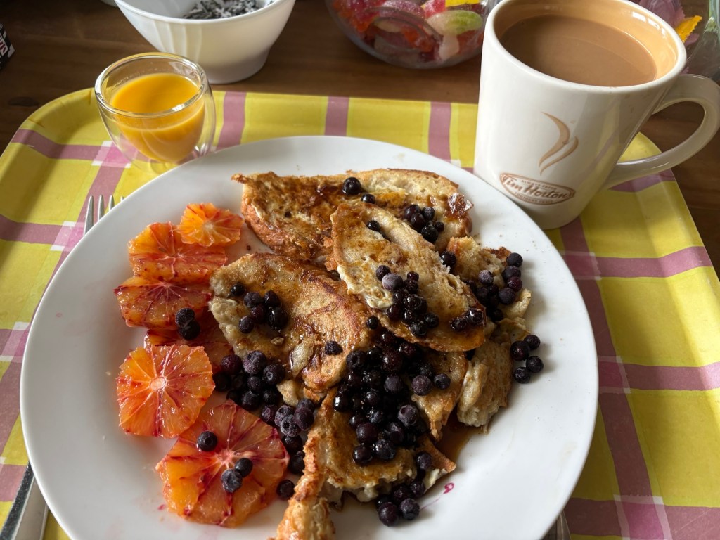 Ich schlafe weniger lange aus, als es nach dem gestrigen Abend zuträglich gewesen wäre, aber soweit ausreichend, da eh ein langsamer Tagesbeginn vorgesehen ist. Entspannter morgendlicher Reboot, irgendwann ein Check-in mit dem Liebsten, der die Nacht auch gut überstanden hat, aber erst zwei Stunden und mehrere Biere nach mir in seinem Bett gelandet ist. Dann stehe ich auf und mache mir zum Frühstück French Toast mit Ahornsirup, Blaubeeren und Blutorangen, dazu Kaffee und Mango-Maracuja-Ingwer-Shot.